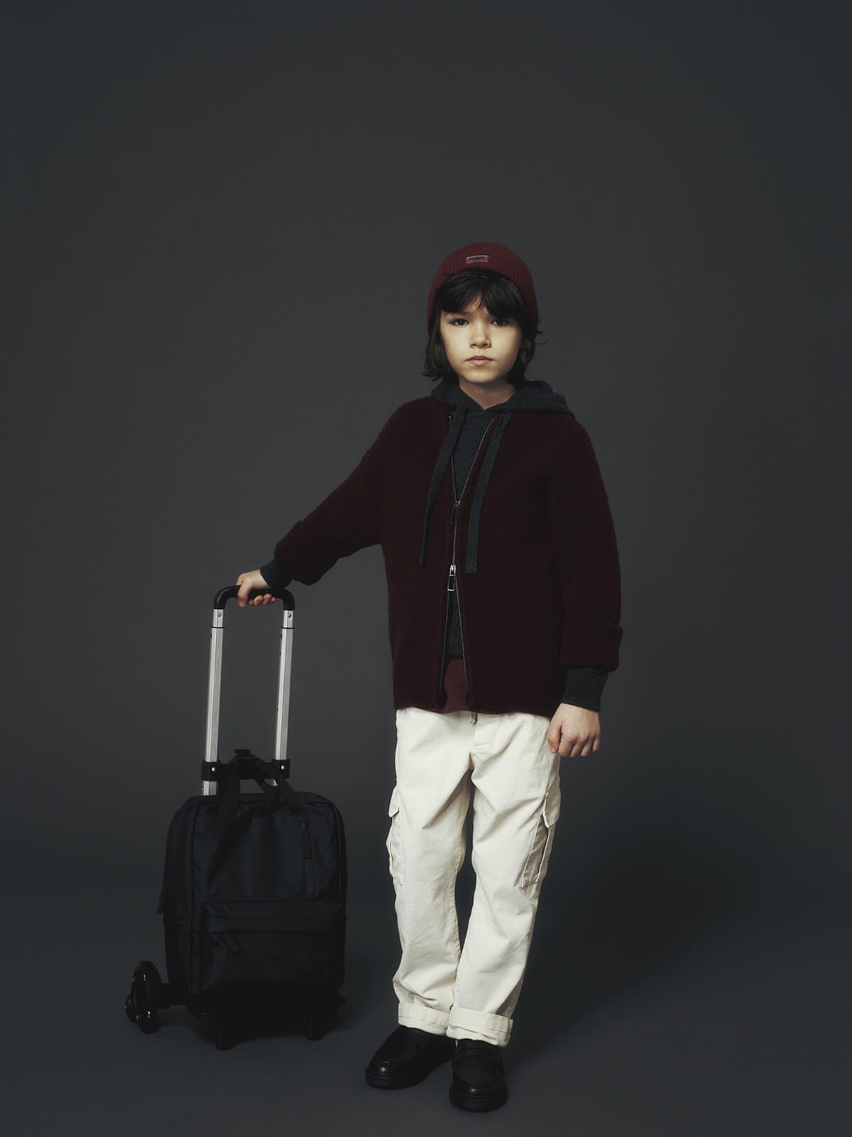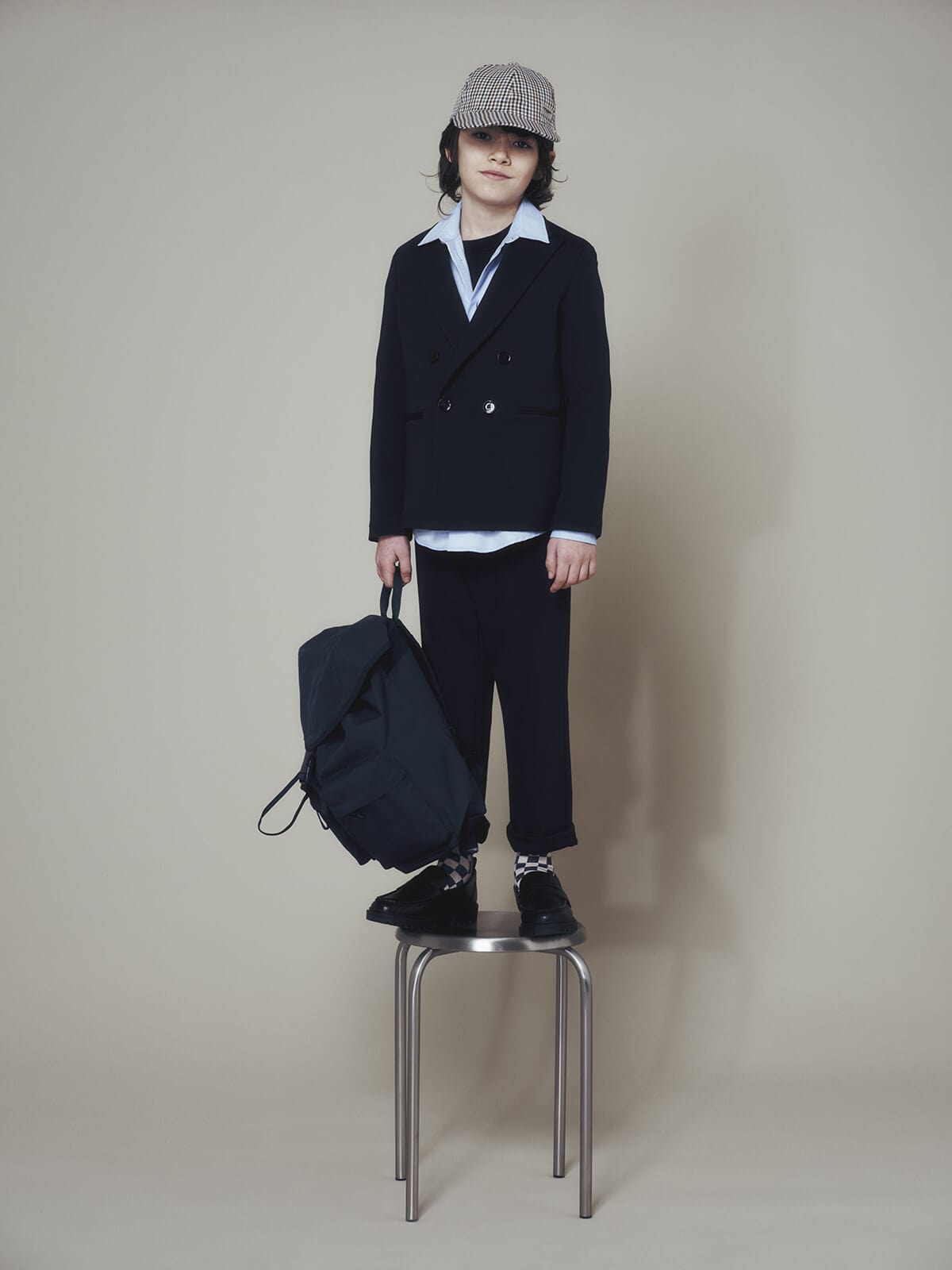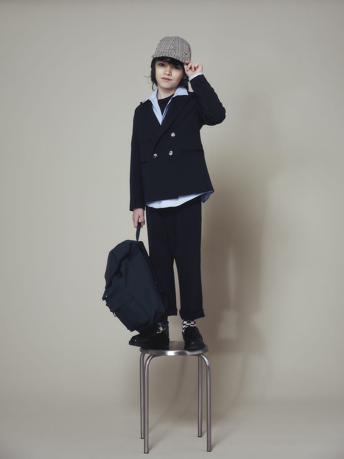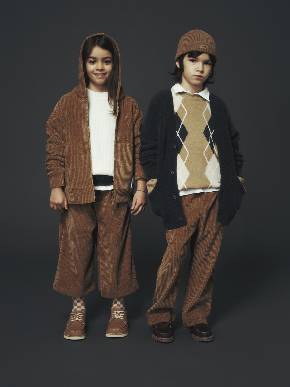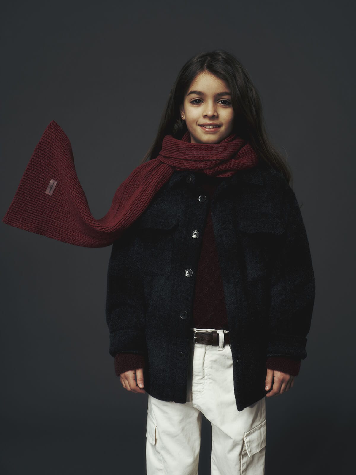 Ogni capo diventa un frammento di immaginazione: i gilet in lana, i pantaloni ampi, le giacche strutturate e i cardigan dal motivo argyle vestono i bambini con la stessa cura riservata alla linea uomo, trasformando l’eleganza in un linguaggio universale.